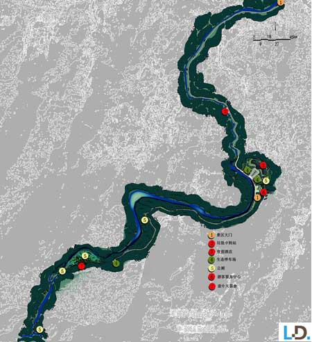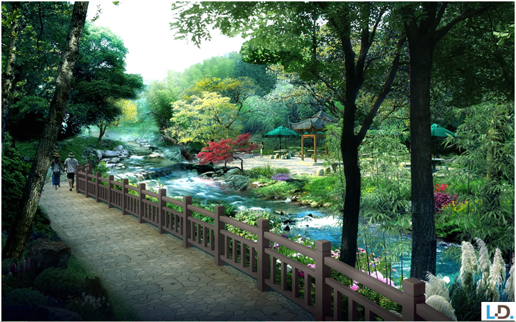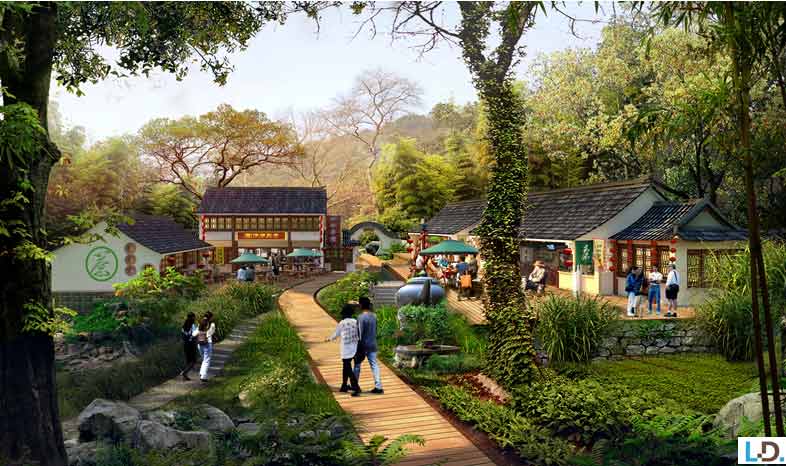 入口服務(wù)區(qū):設(shè)置游客服務(wù)中心、度假酒店、停車場(chǎng)以及相應(yīng)公共服務(wù)設(shè)施,打造龍津溪地的門戶形象。